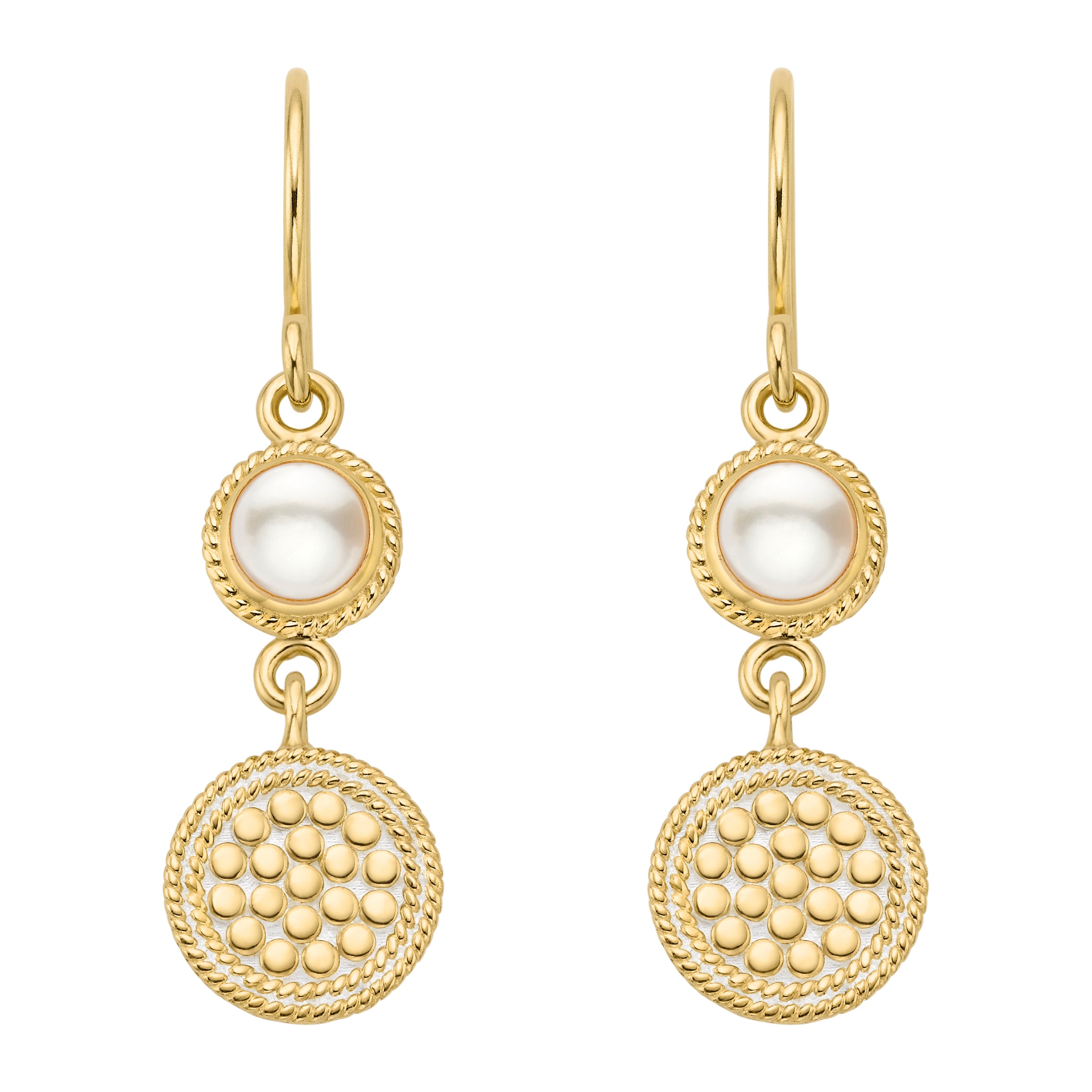 A beautiful pair of white pearl earrings, combined with the iconic Anna Beck dotted disc, set in 18k gold. A timeless pair of earrings from Anna Beck that will elevate any look.