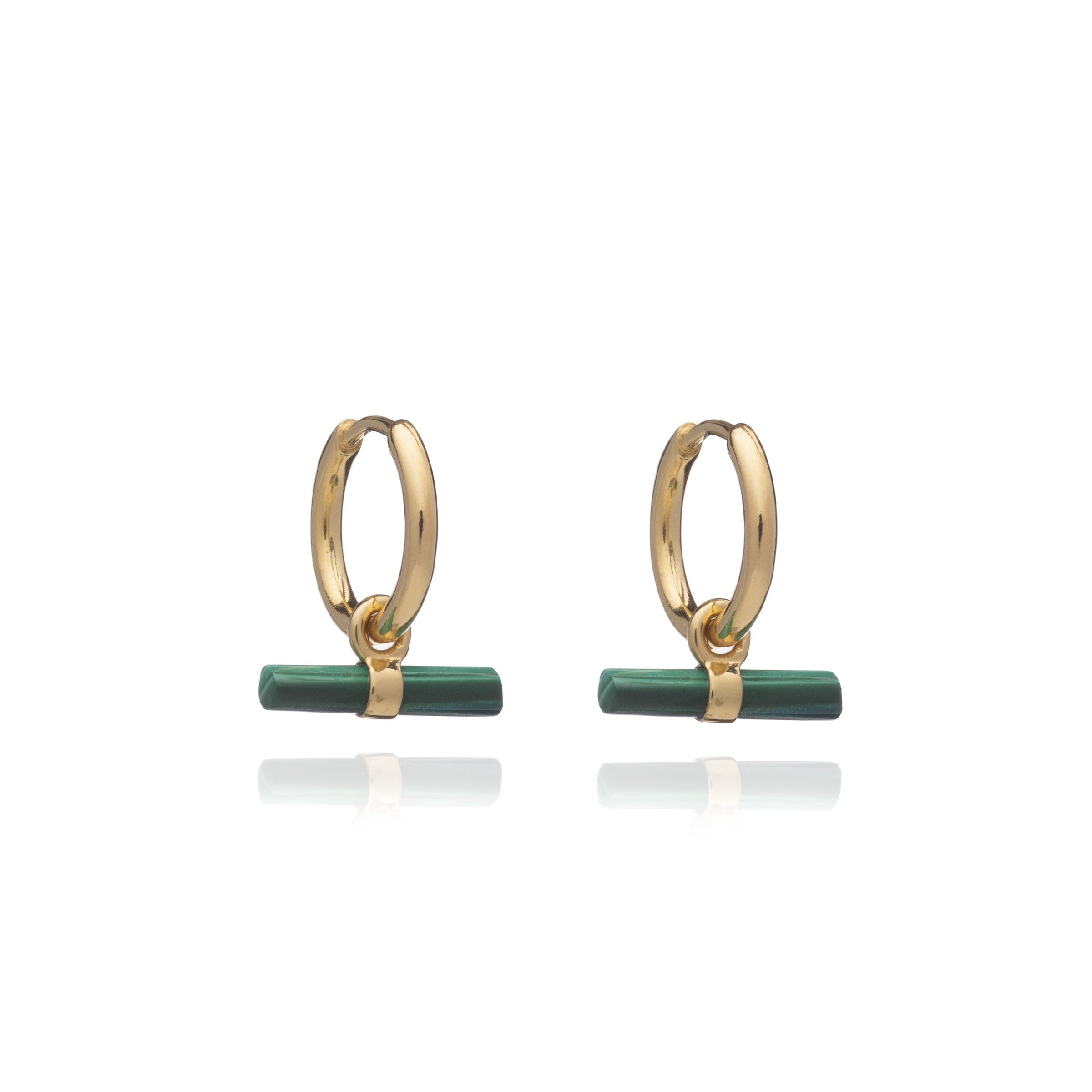 Delicate, easy-to-wear huggie hoops, with a hand-carved, hexagon shaped, malachite t-bar. A perfect minimal earring with modern edge.